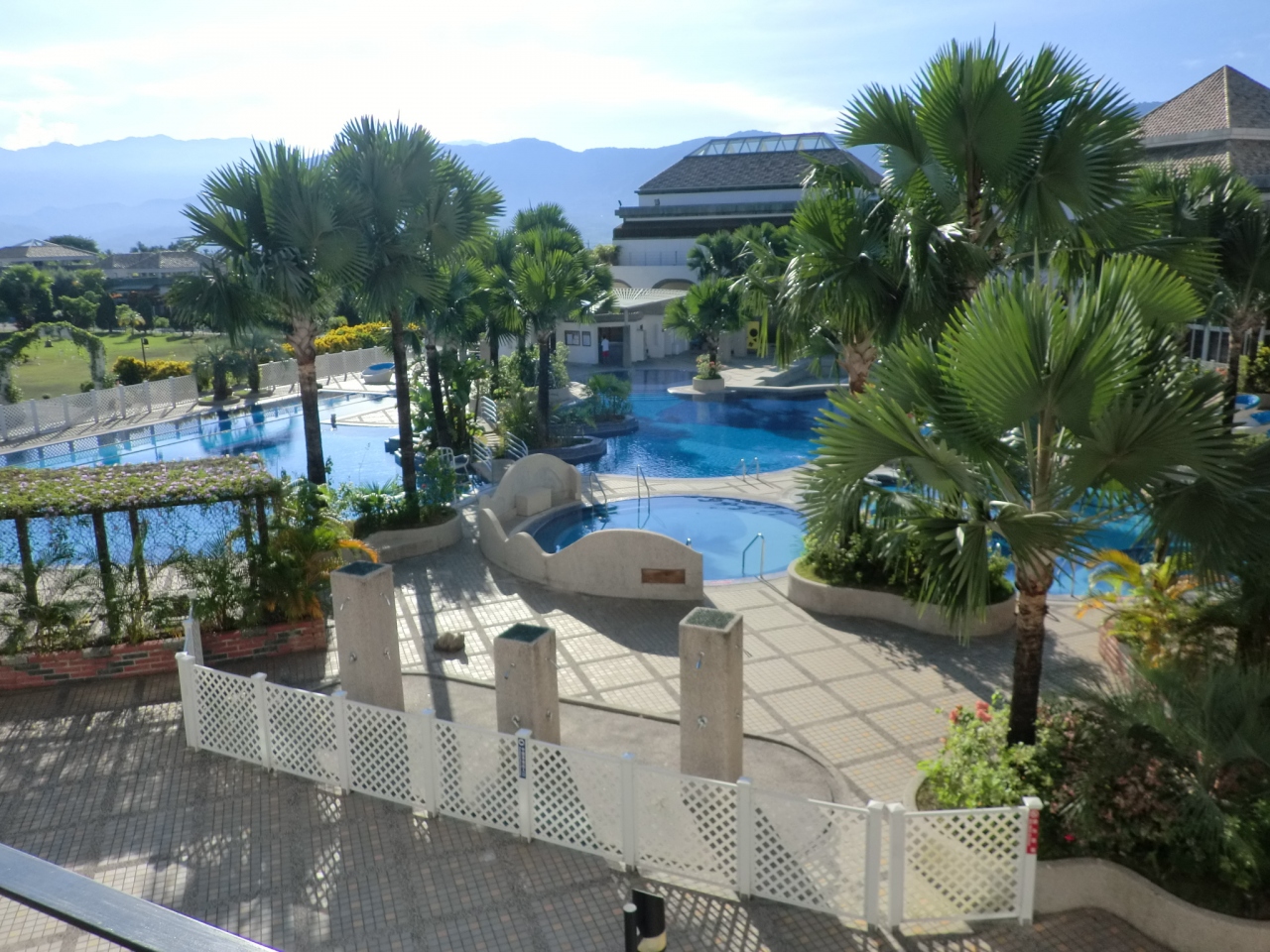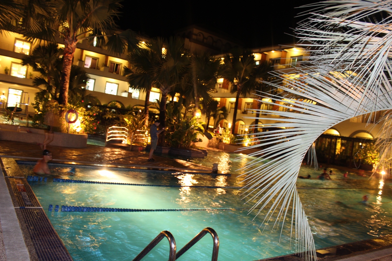 バルコニーからは階下のプールが。繁忙期の団体旅行だけにごった返している感はありますが、従業員もそつなく、しつこくなくてOKです。