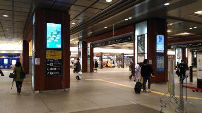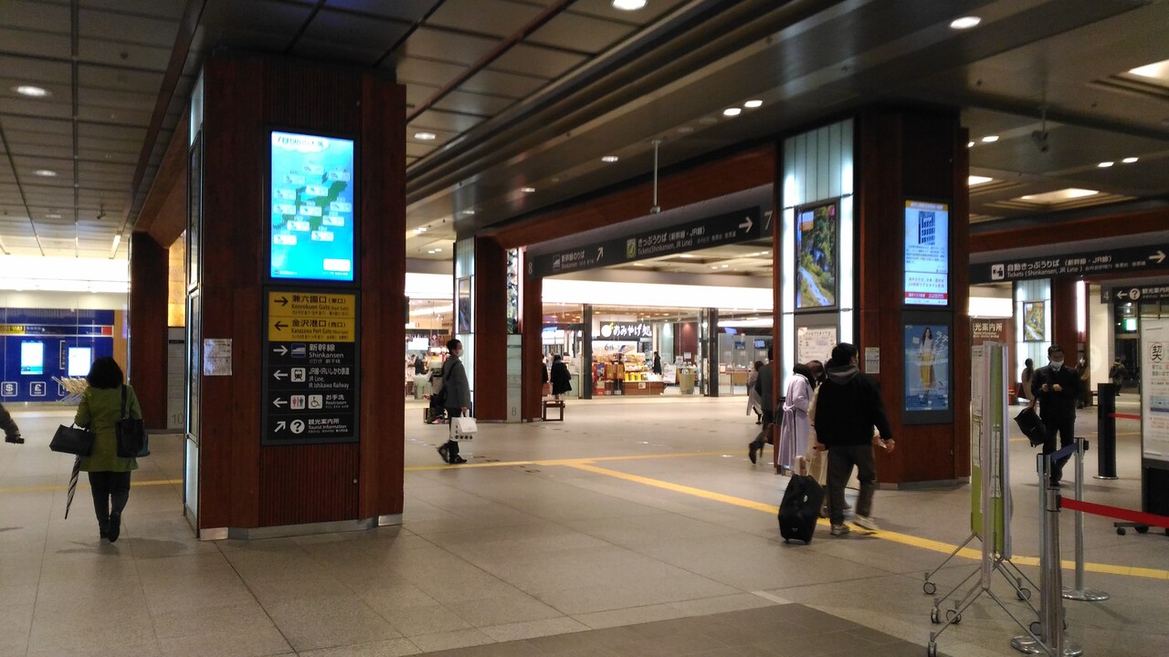 JR金沢駅の一階が、広いショッピングモールになっています。電車で移動する人に合わせて、立ち食いそば屋さんやお弁当屋さんなど、早朝から開いているところもあります。