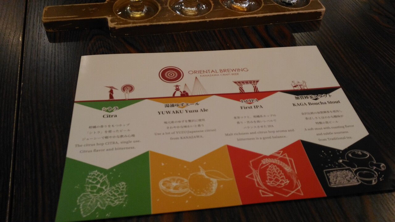 金沢駅西口側のエスカレーターを上がってすぐ。地元クラフトビールであるオリエンタルブルーイングのお店です。とりあえず四種類飲み比べセットを頼みましたが、特にシトラのホップの香りが良かった!加賀野菜を使ったピクルスなどのおつまみもありました。