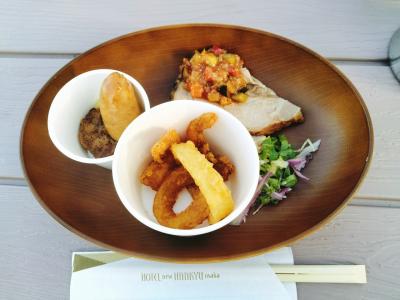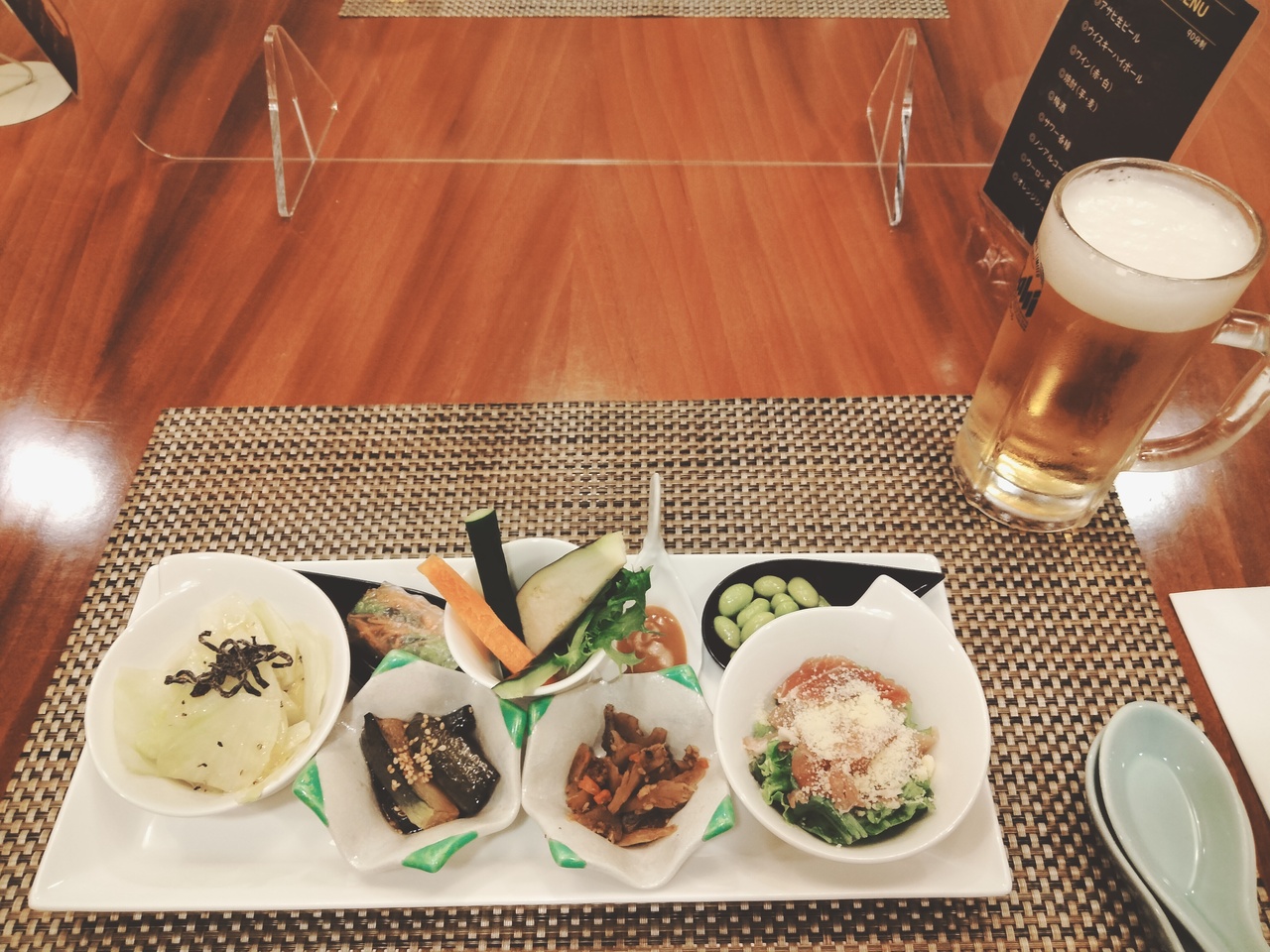 夜は要予約でした。料理のコースとアルコール飲み放題が付いた、一人4千円のプランにしました。最初に野菜料理のプレートが出てきて、体に良さそうな気がします。その後は創作料理や唐揚げ、グラタンなどのメニューがかなりガッツリでてきます。お腹を空かせて行きましょう。