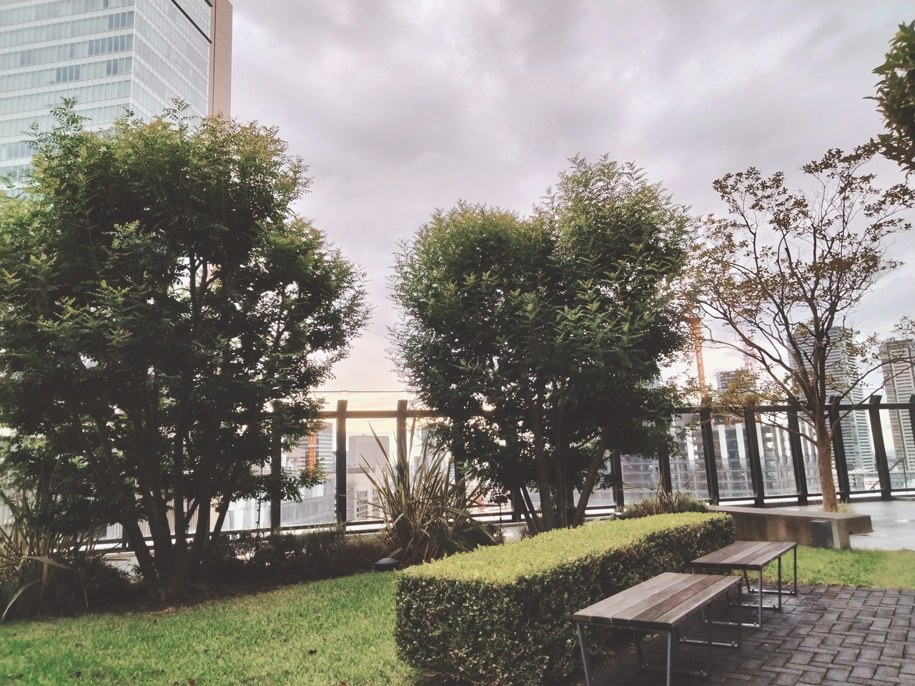 9階はオフィス層へのエントランスとおしゃれなバーだけでなく、出入り自由のテラスもあります。あまり広くはないですが、芝生と木が植えてあり、都会のちょっとしたオアシスといったところ。近くで働く人の癒しスポットになっています。
