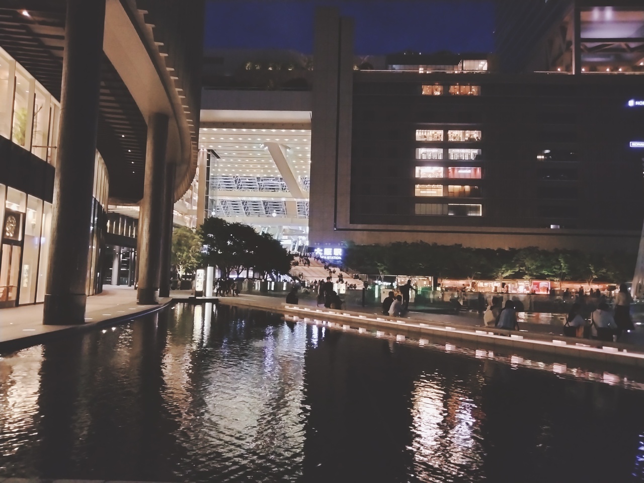 グランフロント大阪の南館と、ルクアの建物に囲まれたスペース。週末はイベントが開かれたり、冬はスケート場が現れたりします。テラス付きのレストランやスイーツショップなどがあり、平日も夜までにぎわっていました。