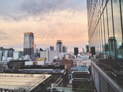 南館と同じく、北館の9階にもテラスがあったので行ってみました。こちらの方が広いです。テラスに出て、さらに階段を昇ると、北区の景色が一望できます。沈む夕日とスカイビル、反対側には安藤忠雄氏が手掛けたというケーキみたいな形の建物がよく見えました。