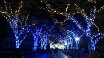中之島のいろいろな場所がイルミネーションで飾られていました。大阪市役所の横から中の島図書館へ続く遊歩道は、キラキラの街路樹と雪の結晶のアーチがまぶしかったです。夜は23時頃までやってるので、仕事やディナーの後にも散歩できて嬉しいです。