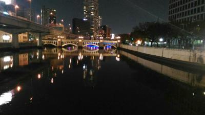 大阪市役所北側にある、歩行者専用の橋。全体的に石づくりのレトロな感じです。夜は明かりが灯っています。堂島川に橋脚のシルエットやビルの夜景が映り込んでいて、とてもきれいだったので思わず写真に収めました。