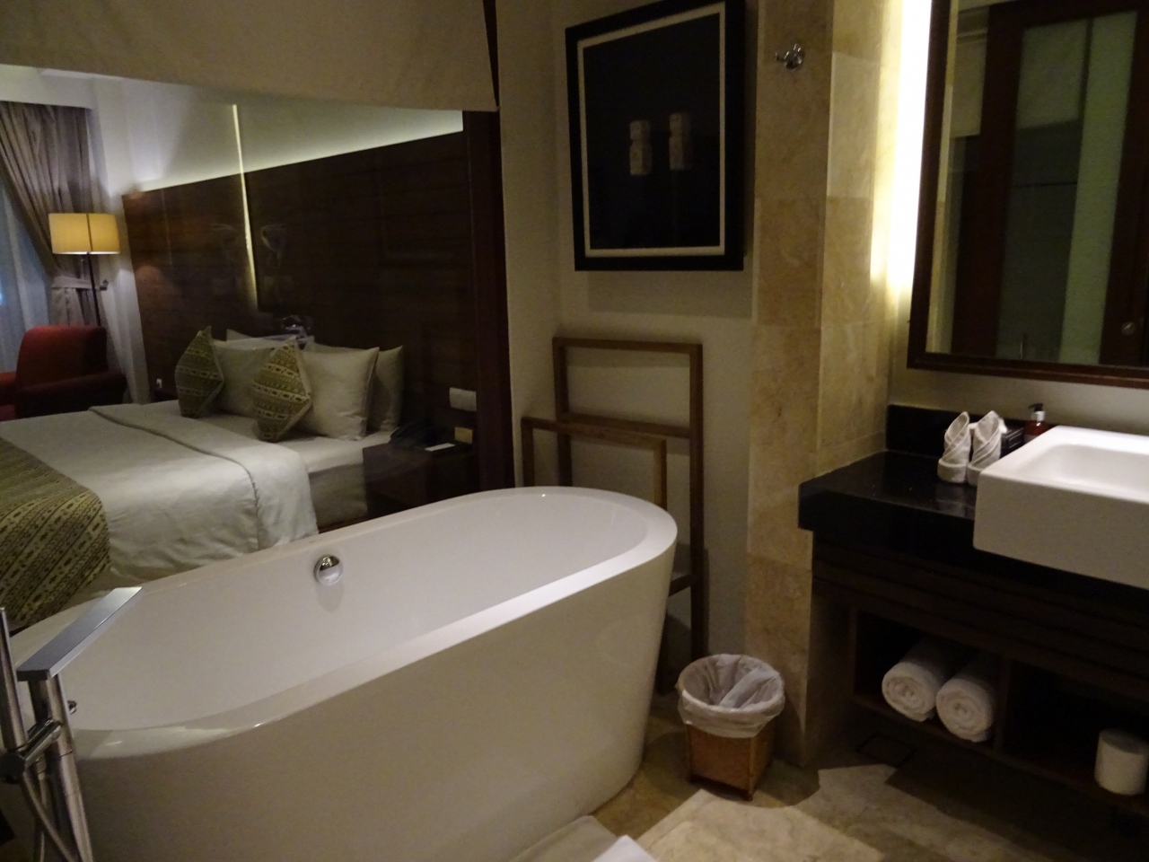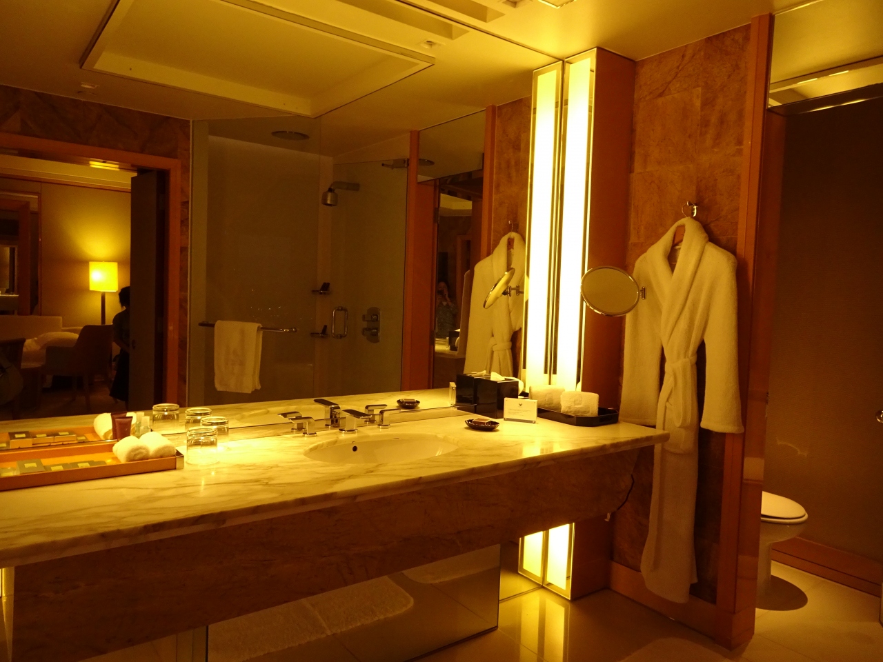 これまでシンガポールでは複数のホテルに滞在したけど、一度は泊まりたかったのがリッツのマリーナベイビュー。お部屋のドアを開けたら、マリーナベイサンズとマリーナベイがドーン。ガーデンズバイザベイもマーライオンも見える。お風呂からも見える。部屋から出ずにして、シンガポールのランドマーク的存在が一望できるなんて最高!もったいなくて部屋から出たくなくなるので注意(笑)。12月後半に行ったので予想より高くつきました(+_+) カランビューであれば割安ですが、やっぱり泊まるならマリーナベイビューですね。