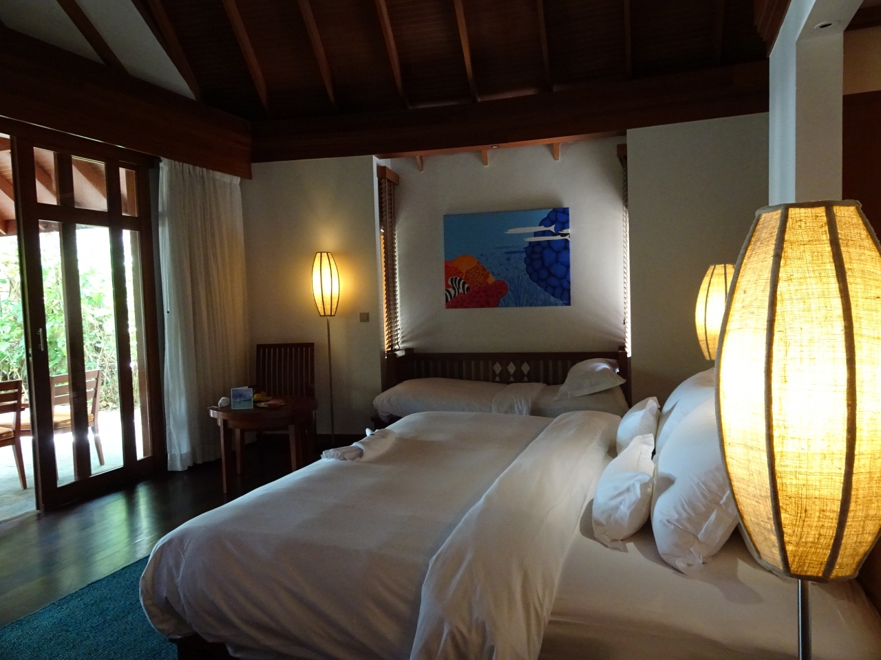 目の前が海のビーチヴィラも砂浜で遊べて楽しく、お風呂は屋外タイプで開放的な作り。水上コテージは午前中は遠浅でどこまでも透明な海で、泳げないわたしでも海に入って遊びたくなる。(その代わり、お魚は少ない)無料でカヤックやシュノーケリングセットが借りられ、近くの無人島へ行ったり、シュノーケリングをしたり。ドルフィンウォッチツアーをオプションで頼んだら、たくさんのイルカが見られて大興奮だった。食事は数カ所のレストランのアラカルトメニューからコースで選べて、どれもおいしいが食べきれないぐらい。雨季だったので少し曇りがちだったが、雨が降るのは夕方から夜中だったので問題なし。晴れた夜は星も見えた。午後は潮位が高くなって波が荒くなるので泳ぎに自信のないわたしはプール付きでよかった。コスパもいいし、子供にやさしいので、家族向けのリゾートです。