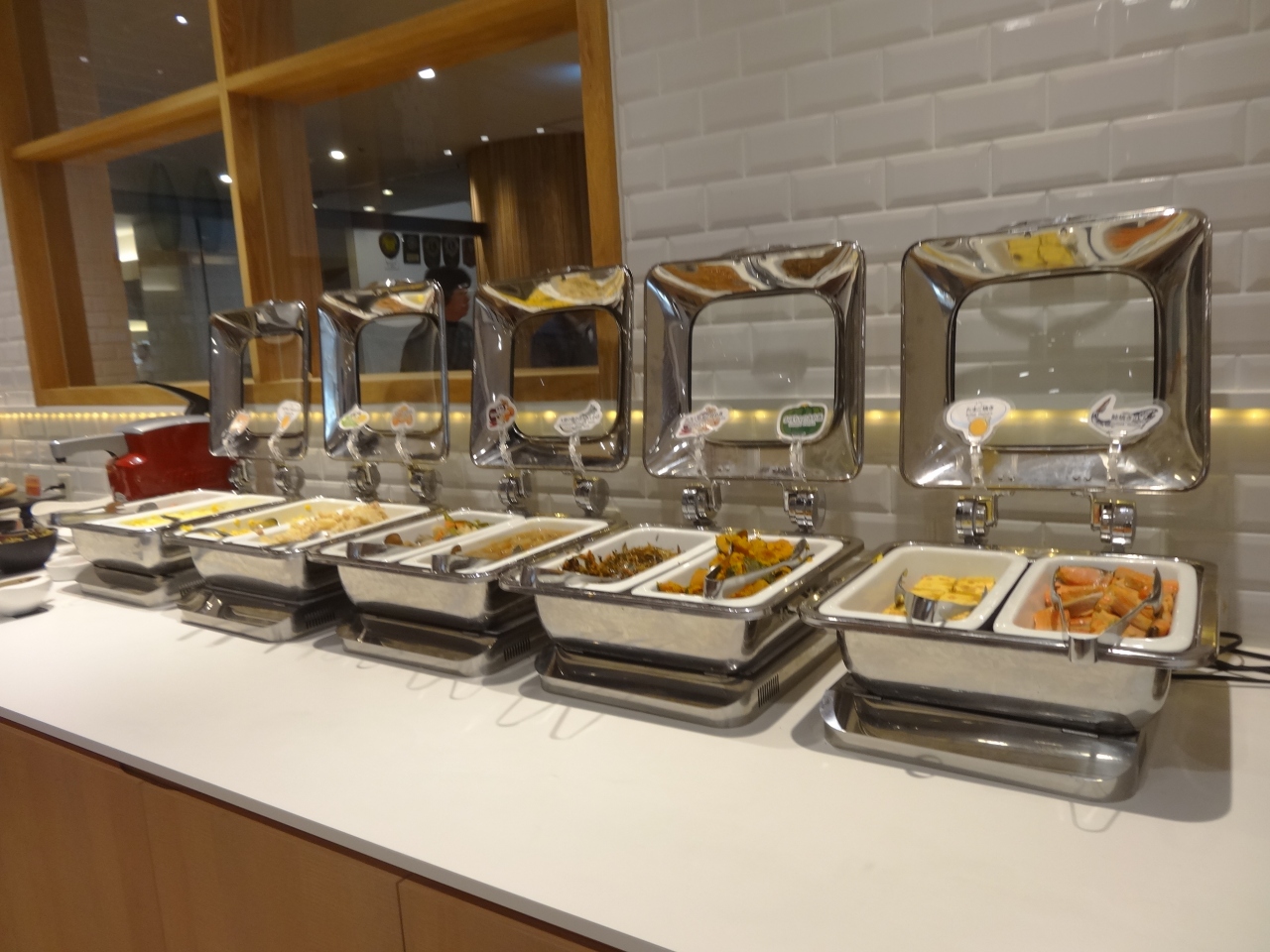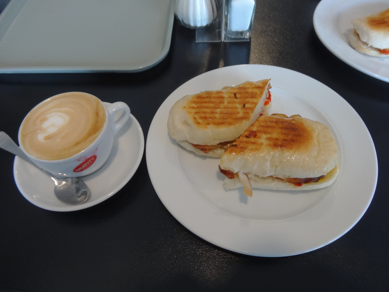 フードメニューをもらい、飲み物はカウンターで注文。シェアするので皿をもらおうと、子供をお使いに出したら、子供の英語を聞き間違えてお兄さんがパンをもってきましたが、これはサービスしてくれたみたいです(^_^;) レストランはビュッフェもあるようでしたが、アラカルトでいいならこちらで十分です。ただ、背の高いイスとテーブルになるので、ゆったりはできません。- 旅行時期
