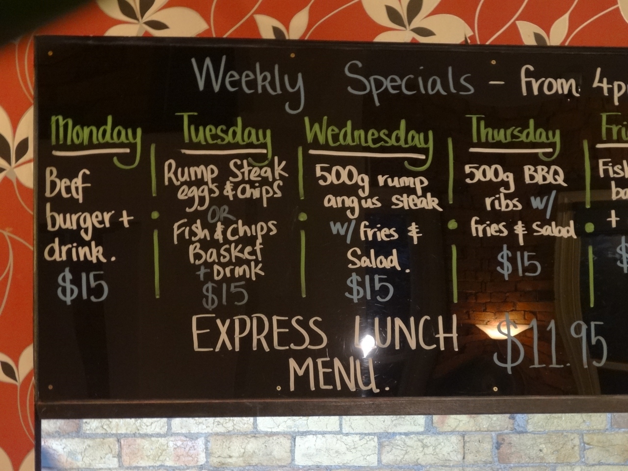 早い時間帯でしたが、ローカルの客でにぎわっていました。ハッピーアワーでビールが安いと思って入りましたが、実際にはハッピーアワーで特定の料理とドリンクのセットが安くなりました。曜日別になっていて、そのメニューが黒板に書いてあります。