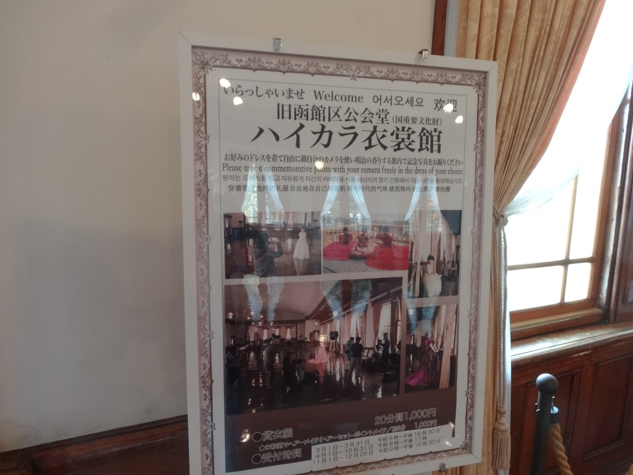 印象的な外観。内部も立派な調度品があったり、時代が感じられます。でも、何と言っても娘にはハイカラ衣裳館がよかったようです。1000円で衣装が借りられ、1000円でヘアメイクもしてもらえ、モデルになった気分で館内で自由に写真が撮れるのがたまらなかったようで、後から「楽しかった~」と大満足でした。女性グループにも人気でした。あまりに人気のため、ヘアメイクの待ち時間があったり、ドレスがなかったりしました(^_^;)