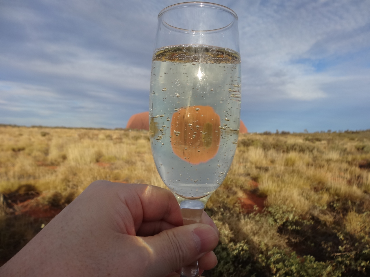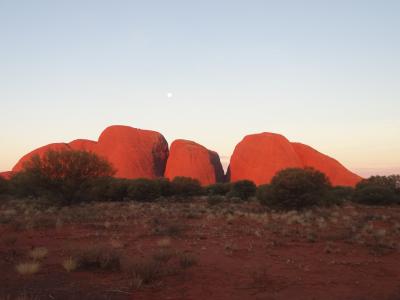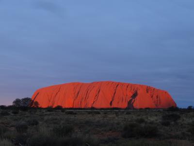 いろいろ悩んで、英語ツアーに参加しました。夕方サンセット・ビューイングエリアに大型バスで連れて行ってもらい、現地ではスパークリングワイン(他に赤ワイン、白ワイン、オレンジジュース、レモネード)とおつまみ(ポテトチップス、ドリトス、キュウリとニンジンのディップ、ビスケット類)を楽しみながら、目の前のウルルが徐々に色を変えていくのを見ます。数分おきに同じ位置から写真を撮るといいよと言われました。日が暮れる瞬間、ほんのわずかな間ウルルが真っ赤に染まります。その姿がとてもきれいで印象的でした。
