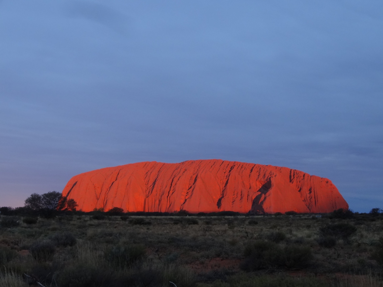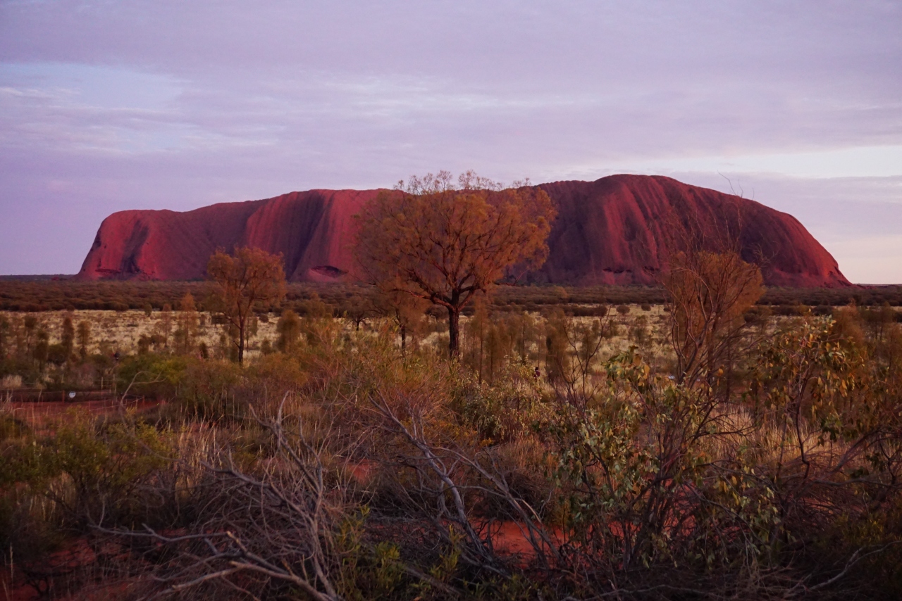 今回英語ツアーと日本語ツアーで料金にかなり差があったため、英語ツアーを選択。朝日が昇る1時間半前にピックアップだったので、朝5時半にホテルを出ました。真っ暗な中サンライズ会場でコーヒーや紅茶、ココア、ビスケットがもらえます。そのままウルルを見るスポットへ各自移動。徐々に明るくなっていくウルルを眺めます。朝は結構寒かったです。コーヒーなどが出るのでどこかのポイントで手持ちの朝ごはんを食べられるものだと思い込んでいて、朝ごはんを食べ損ねてしまいました(^_^;)