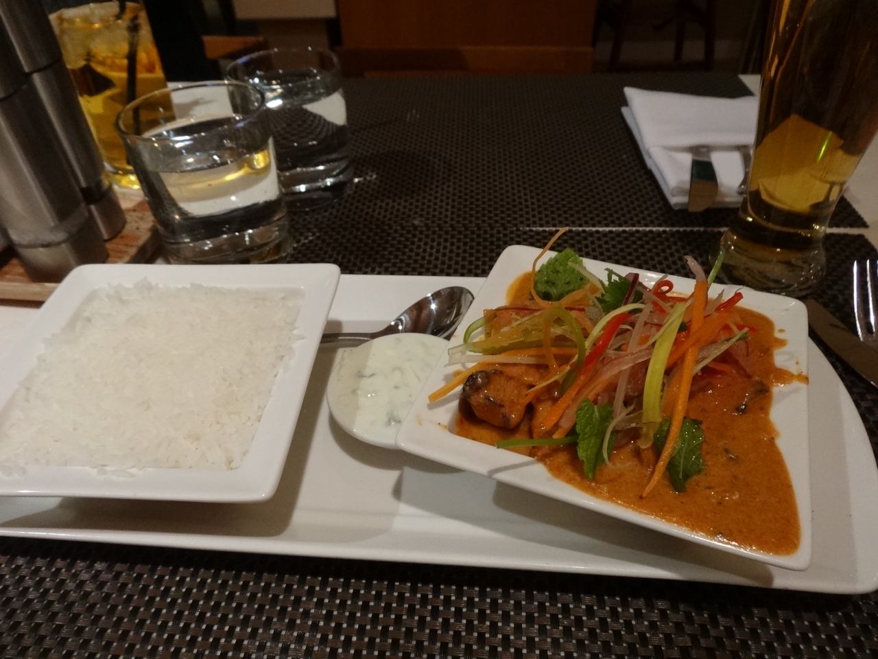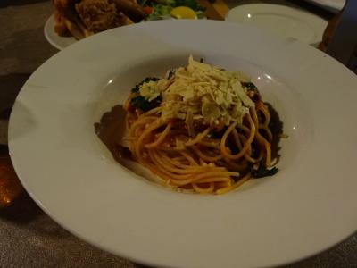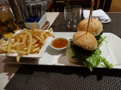疲れたので遠出せずにホテル内で遅い夕食を食べることに。イルカりレストランに入ったら、あと少しで終わりだと言われて、隣のバーエリアへ行くように言われました。レストランとバーには仕切りがありません。