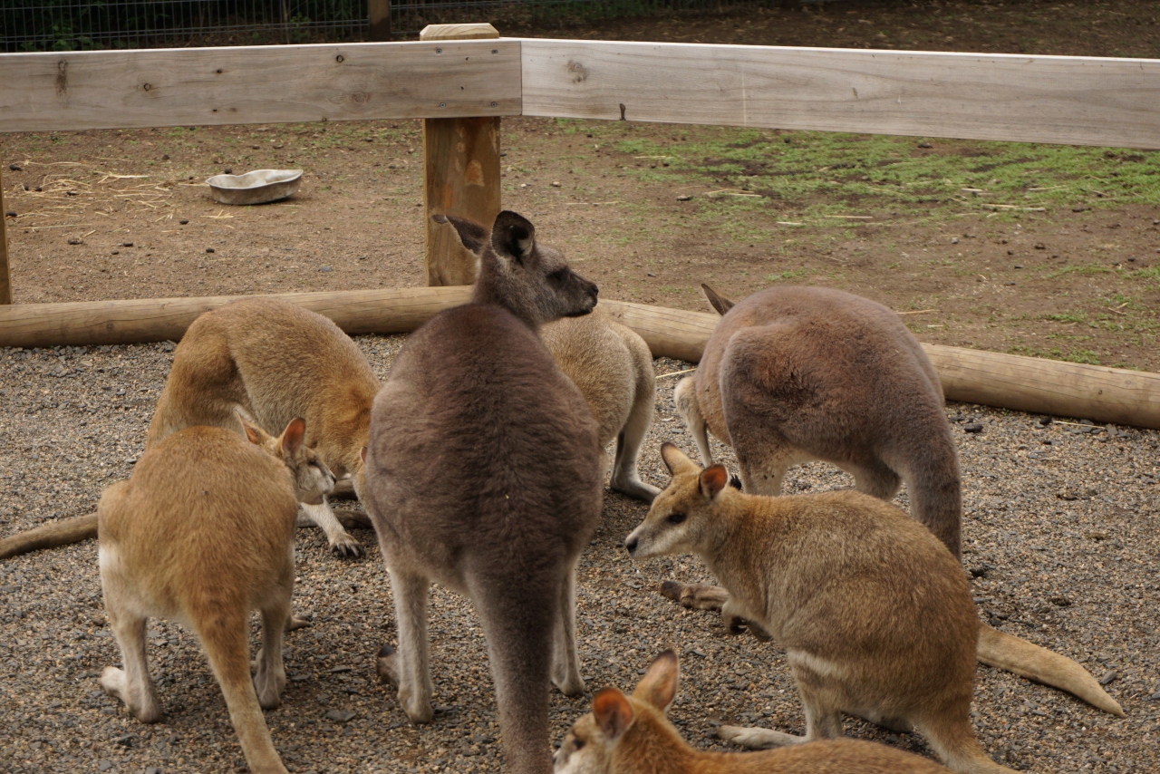 カンガルーやワラビーにエサをやる場所もあり、子供が楽しみにしていましたが、入ってすぐのエリアでは来場者が次々とエサをやるせいか、エサに興味なし(^_^;) 奥にもカンガルーたちに餌をやるエリアがあり、そちらはあまり人がやらないのか入っていくとカンガルーたちが寄ってきます。エサやりを満喫したい場合はこちらがおすすめです。