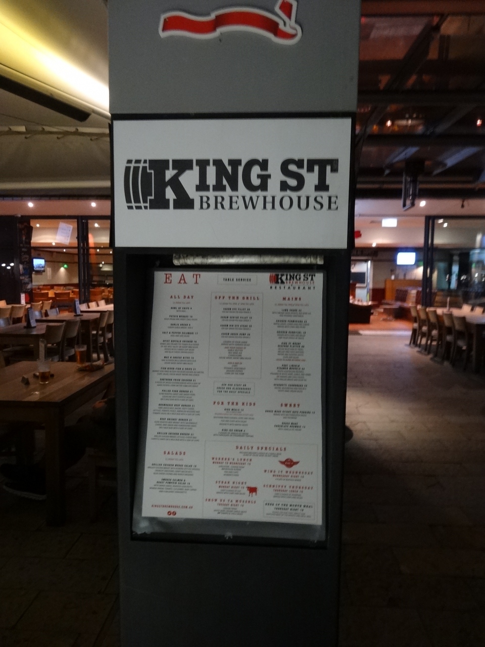 ダーリングハーバーにはたくさんレストランがあり、屋外で飲食できるお店もたくさん。その中でブリューハウスがひとつあったので行けたらここに行こうと思っていました。この周辺のお店同様ハッピーアワーもある他、曜日ごとにスペシャルメニューがあります。行った月曜日にはミニサイズ(といっても十分な大きさ)のステーキとサラダ、ビールがついて15ドルというメニューがありました。