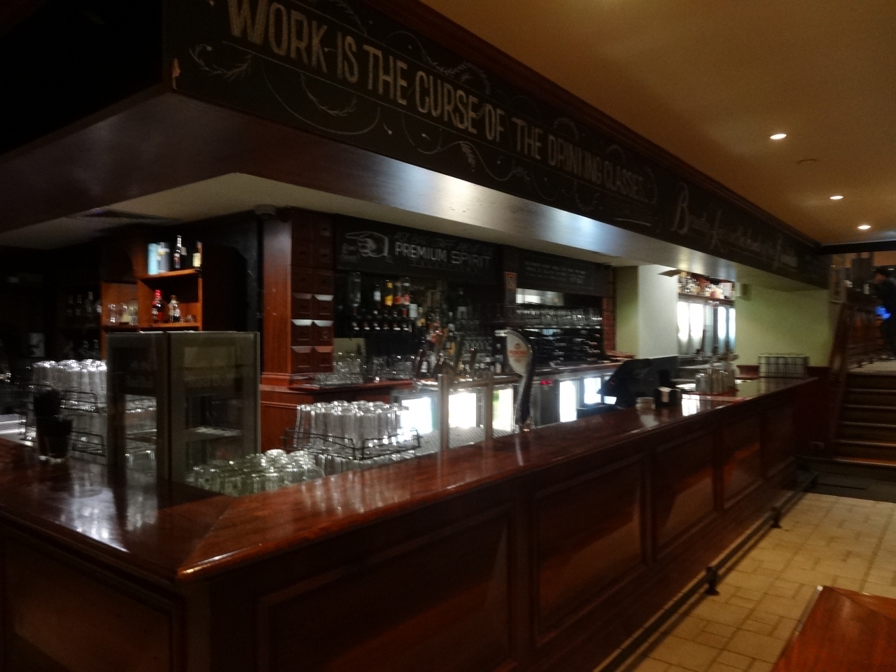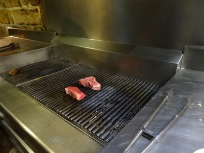 入口を入ると狭いパブのようですが、奥が広いです。日曜の夜だったせいか、パブエリアもレストランエリアもガラガラでした。肉のカウンターで最初に説明をうけます。黒板に値段が書いてありますが、どれも35ドル~となっていました。ここは時価のようなので、値段が変わると思います。どれも分厚いすぎるぐらいの肉です。肉を自分で焼きたくないなら、確か22ドルぐらいで調理済みのものを選べるということでした。
