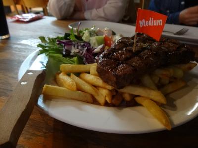 肉をどのくらい焼いたらいいのか聞いたら数分と言われたけどお兄さん、アバウトすぎ。かなり長いこと焼きましたが、分厚いお肉だったので、それでもレアに近いような感じでなかなか苦戦しました。あとから焼き加減について説明が書いてあるバーベキューエリアが近くにありました。結局大きなお肉もそれほどおいしいわけでもないので、持て余し気味。自分で焼くという経験ができるのは面白いものの、満足度はいまひとつ。パブの安いステーキ肉でうちは十分かな~と思いました。