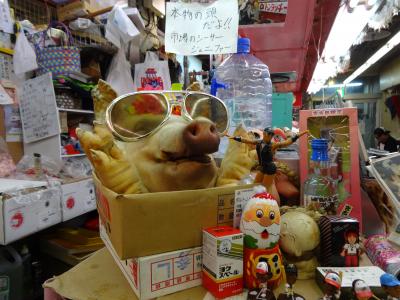 豚の顔が置いてあるお肉屋さんはサービス満点で試食したラフテーはくせがなくておいしかったです。結構な量が入っていたのが売っていましたが、残念ながら帰る日まで時間があるので買いませんでした。