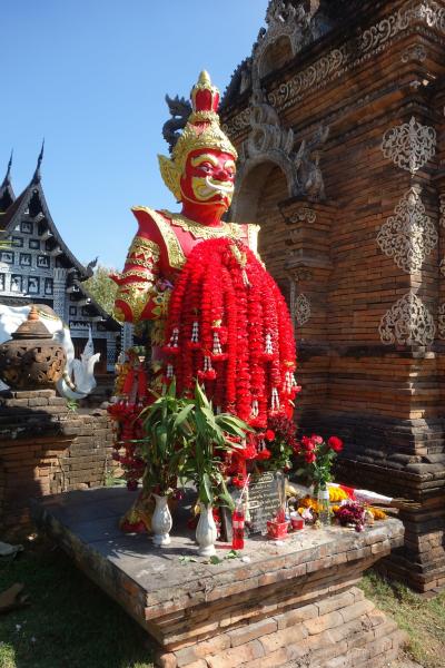 チェンマイ ワットロークリモーリー寺院のヤック(左右に赤と緑の立像) ...