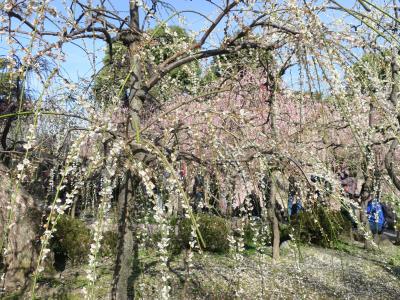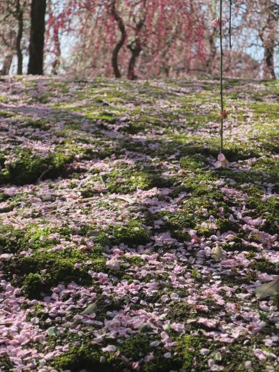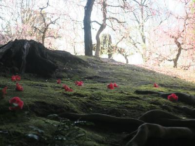 バス停から近いです。梅の本数はそんなに多くないように書いてあったのに、行ってみたら見たことのない「しだれ梅だけの梅園」で、とてもたくさんに見えました。見ごたえ抜群です。つばきも種類が多くたくさんあるのでつばき好き・源氏物語好きにはとても良いのではないかなと思います。今回散りかけで散り梅・散りつばきがありましたが芝生の緑に梅やつばきの美しい赤やピンクが映えてとてもきれいでした。