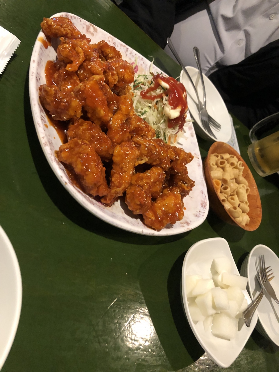 ヤンニョムチキンは少し甘めで、ピリ辛と合わせてとても料理が進みました。合わせてよく食べられる大根の漬物もしょっぱいではなく、少し甘めなので、生ビールととっても会いました。