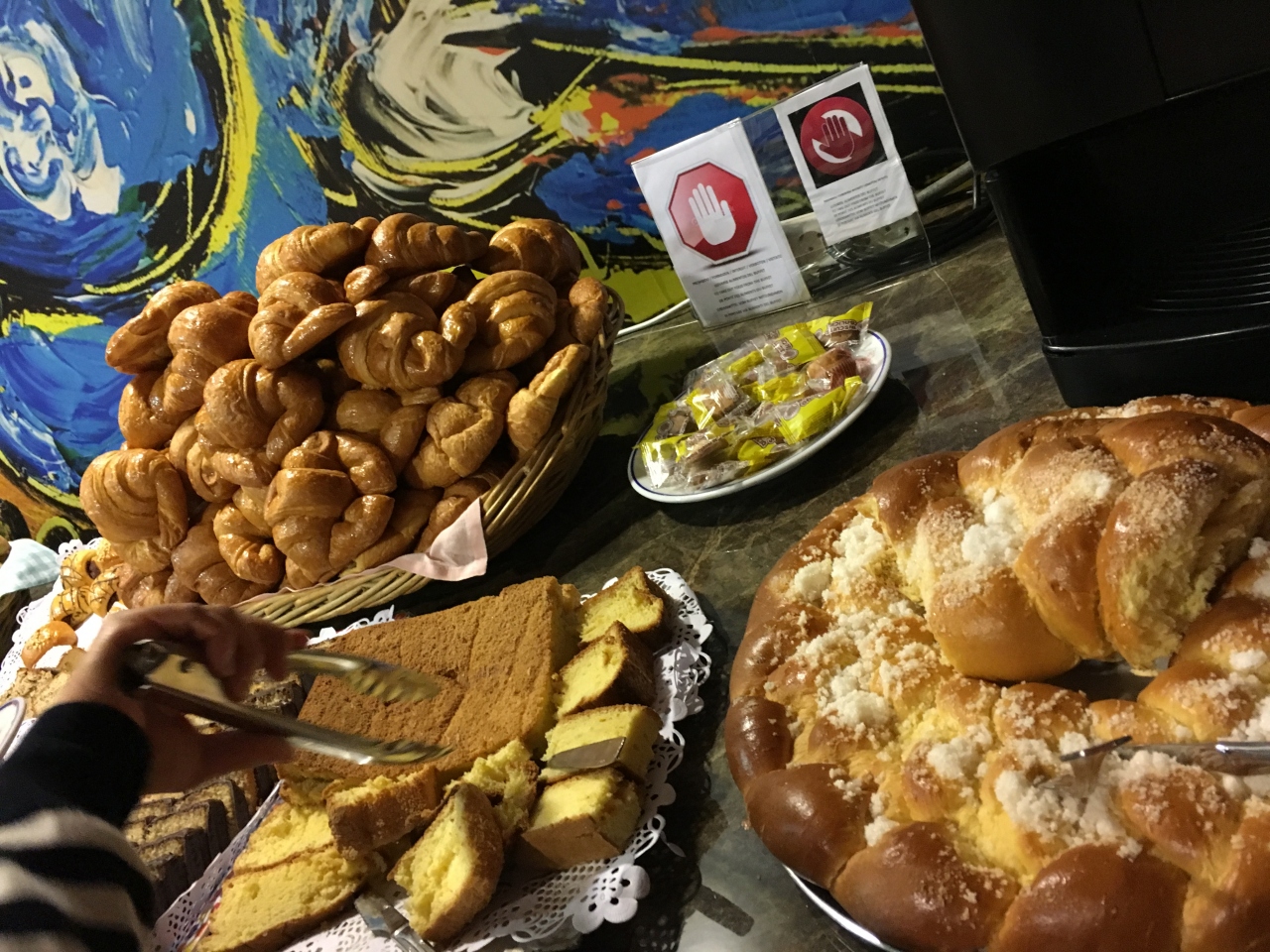 食事が本当に素晴らしいです、スイートパンの種類が多く、果物も一杯ありました。ディーズなどの干し果物もありました。デザートも充実してました。