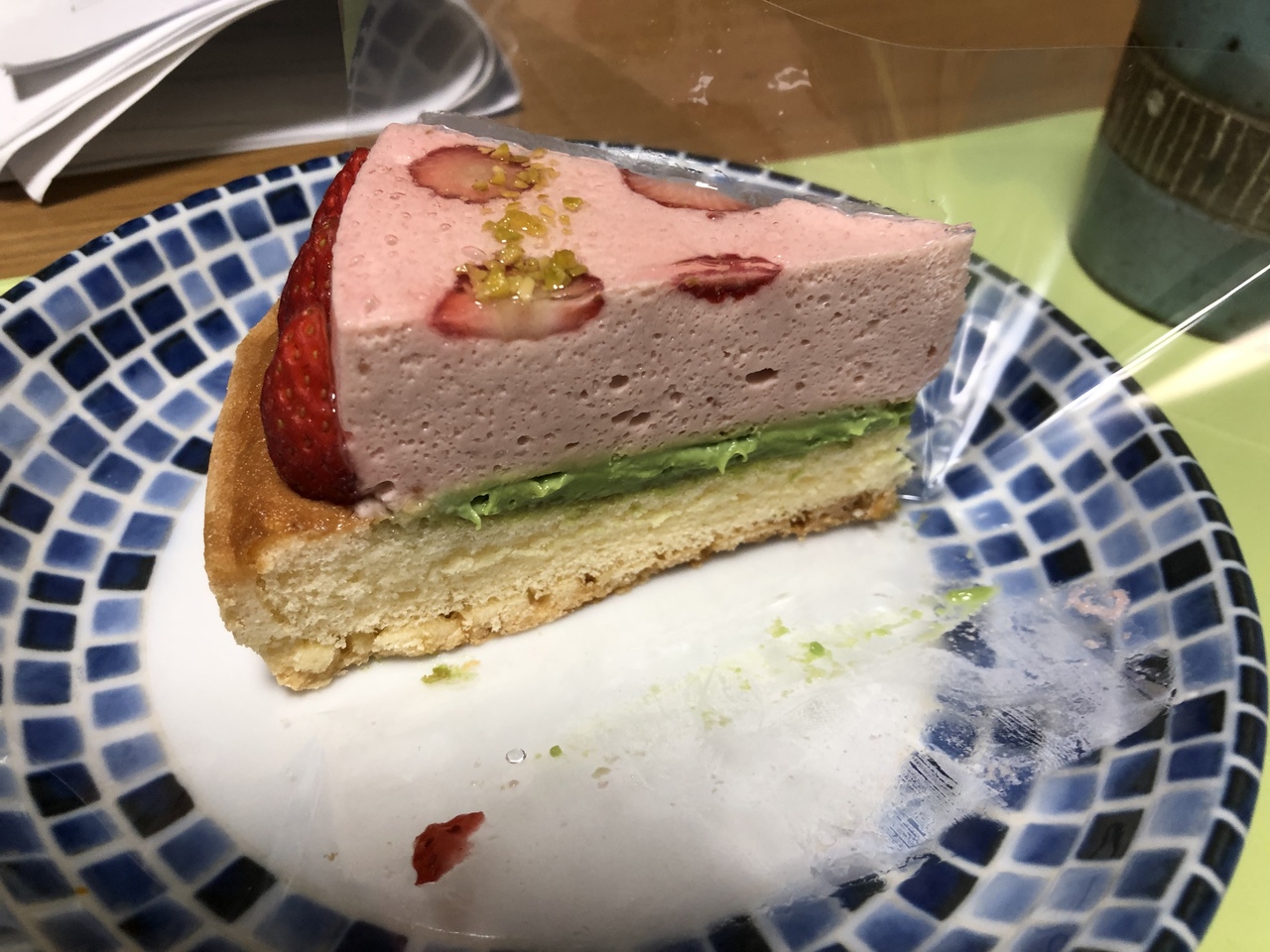 ケーキをテイクアウトしました。結果お客さんが並んでいて人気がありました。イチゴとピスタチオのタルト590円、モカゼリーのソフトクリーム400円を注文しました。物語はそのままその場で食べました。では2角でソフトクリームとの相性がよかったです。次回は普通のソフトクリームにしたいと思います350円とトライしてみたいと思います