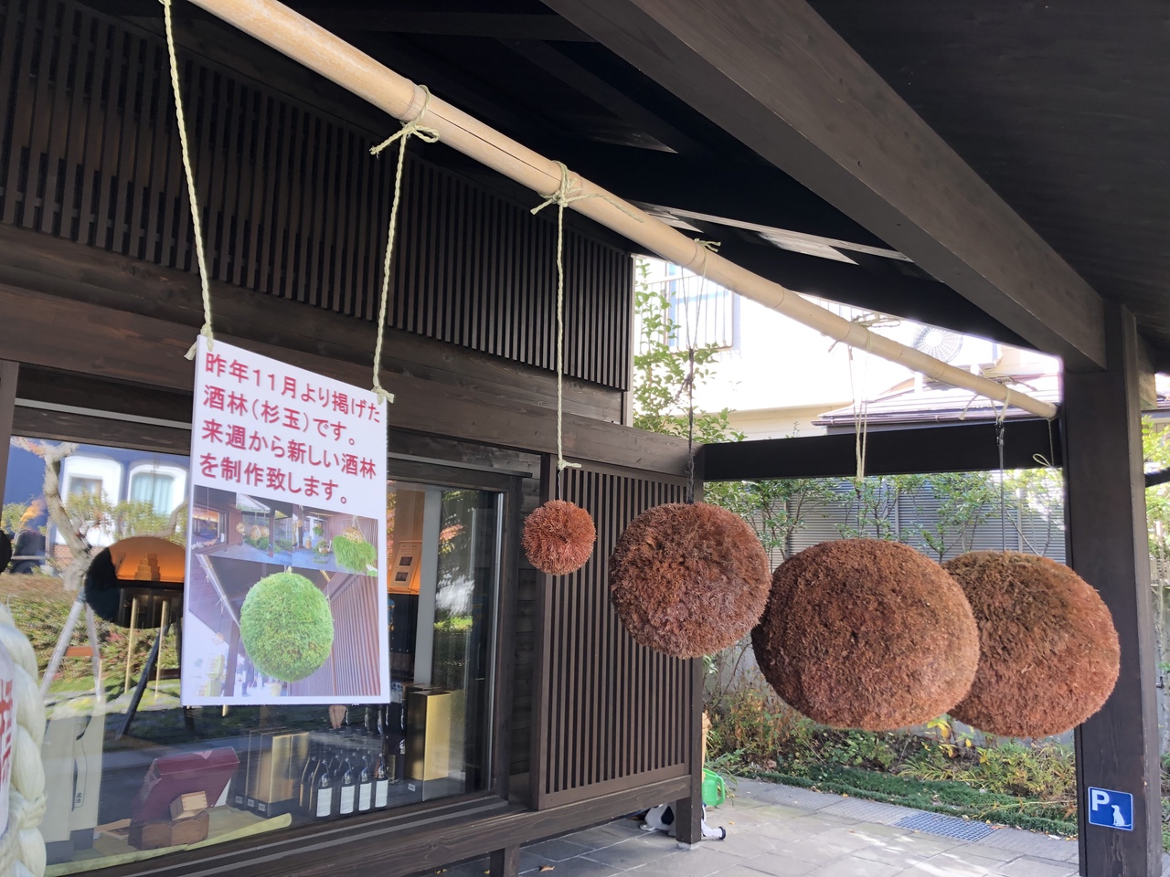 入り口には大きな丸い玉が飾っていて、紅葉の時期だったのでだいぶ色は変わっていました。で真ん中の庭では立派な末がありました行った時はちょうどショップの展示もありまして、お酒だけじゃなくて器や諸経費等も見ることができましていろいろ楽しめました