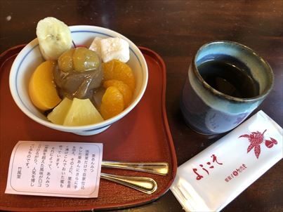 秋の時に行きました、この時期しか食べれない栗あんみつをいただきました。700くらいで、大変お上品な味でした。バナナ、栗、ミカン、杏が入っていて、サイズは程よいおおきいさで、噛み甲斐があり、じっくり味わえてお勧めです。