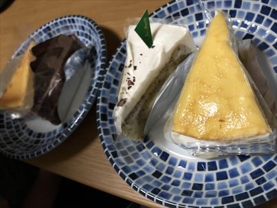美味しいケーキを買って帰りました。1つはなんと100円くらいでした、大変お得で、ぜひお勧めします。チーズケーキ、チョコケーキ、ティラミスとパンプキンケーキをいただきまして、どれも美味しかったです。
