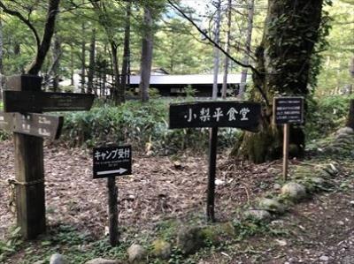上高地の河童橋から歩いてすぐのところに、小梨平キャンプ場があるところでした、近くに小梨食堂もありまして、キャンプ場は川沿いにもあり、キャンプ場に泊まりながら、山岳の写真をとっている方がたもいました。