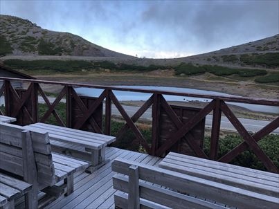長野県側からの乗鞍エコーラインを使って、バスで山頂バス停で降りれば、歩いてすぐに白雲荘につきました。山荘前のテラスのベンチから、乗鞍岳を眺めることができました。
