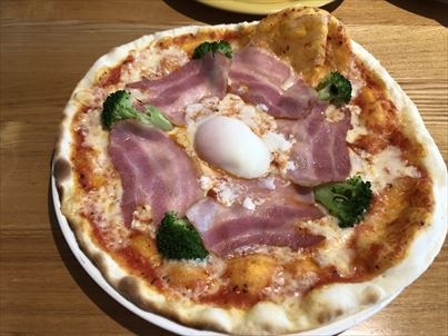 ビスマルクがお勧めランチの時はなんと1078円でして、ボリューム満点で、ピザが薄く、オンたまごが柔らかくて最高に美味しかったです。