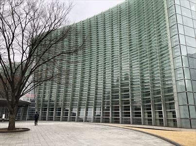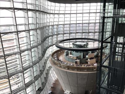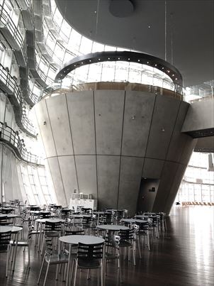 国立新美術館の内部と一望できる、巨大な逆円すいの最上部の素晴らしいロケーションでした。