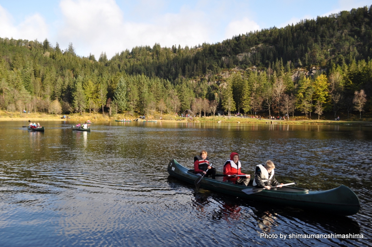フロイエン山にはいくつかのハイキングコースが用意されていますが、私達は少し足を伸ばしたところにある湖までお散歩しました。もみの木の林や、カヌーを楽しむ子供達の姿など「これぞノルウェー!」という景色も堪能できてとても楽しかったです。