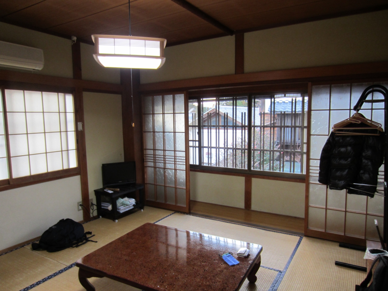 部屋は8畳/6畳一間、布団(は清潔で質もOK)は自分で敷き、洗面所は共同・・・