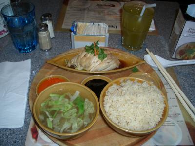 ここの名物は海南チキンライス(写真)。確か18ドルくらいで、フードコートで食べる場合に比べたら決して安いとは言えませんが、チキンは程よい柔らかさに蒸されていて、ダシでしっかりと炊き込まれたライスとの相性も抜群でした。チキンは味がついているのでそのままでも充分ですが、3種類のソースがついています…なかでもジンジャー風味のソースがさっぱりしていて美味しく感じました。