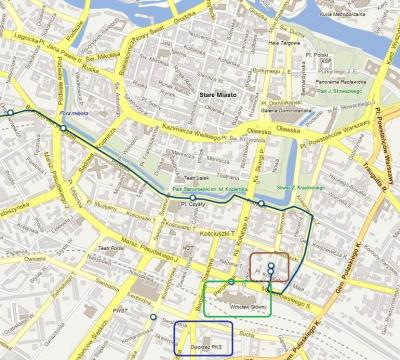 Olsztyn中央駅前〜レシェル駅前までの路線あり