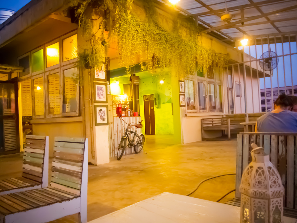 1階はカフェになっていて、ノスタルジックなデザイン。共有部分や部屋も絵が描かれていて個性的。そして、なんといっても夕方からオープンする屋上のバーでみる夕暮れは、なんとも美しくて、巨大な仏像の向こう側に沈んでいく夕陽を眺めながら飲むビールは格別です。