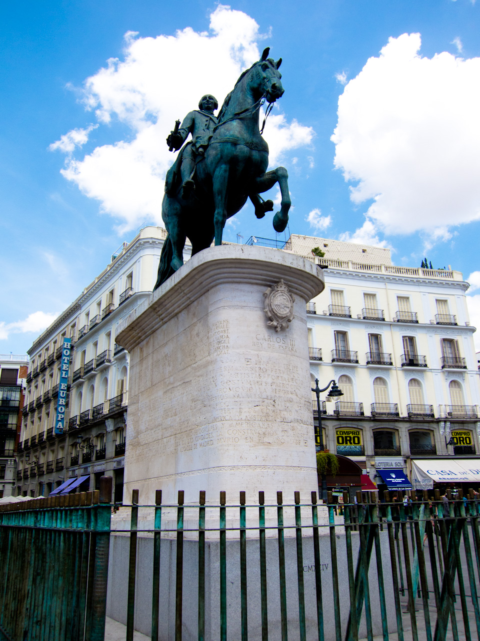 スペインの日本橋的なところで道路の起点標識があり、地下鉄でも複数の路線が乗り入れるターミナルとなっているSOL(ソル)駅の真上にあるというマドリードでも中心地的な場所。