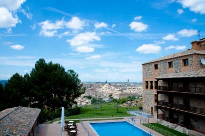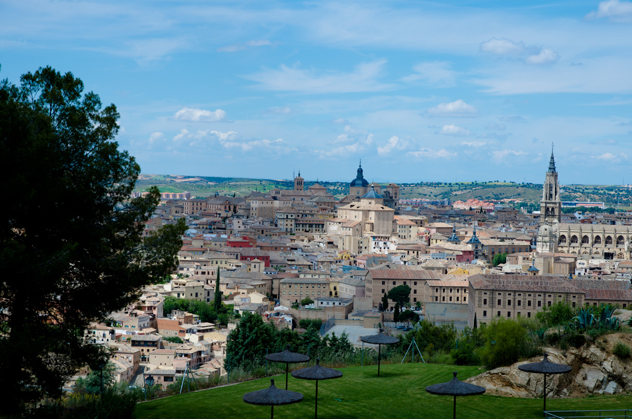 トレドの旧市街地からは歩くと30分くらいかかるのでタクシーでの移動になるのですが、高台にあるホテルから見下ろす旧市街地は絵本の世界のようで、いつまでみてても飽きません。部屋のベランダからも眺めることができるし、宿泊客は宿のテラスみたいなところで芝生に寝転んで眺めたりすることもできます。