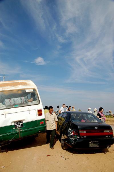 で、この道を3回ほどバスで走ったことがあるのですが、そのうちの1回はどうも初めからバスのブレーキがおかしかったらしく、シェムリアップから悪路に入ってしばらくしたらブレーキがきかなくなりあやうく川に落ちそうになって事故ってしまいました・・。