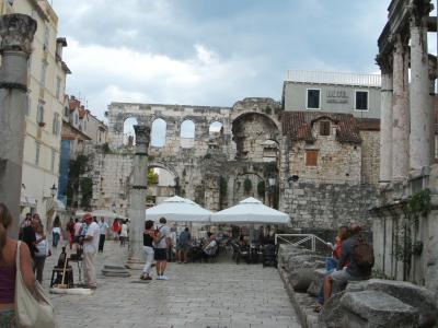 Splitはホテルの数がドブロブニクほどなくて(特に旧市街近く)大きなホテルも余りありません。私は英国系ホテルサイトのランキングでも1位だったペリスティル(中級)に宿泊しましたけど良かったです。大聖堂の隣にあり、宮殿・バスターミナル・フェリー乗場、とどこにも近くて最高の地の利です。小さいホテルで、ちょっとスペースは狭いですがこの場所だと仕方ないと思います(シングルルームでシャワーのみでした)。スプリット滞在でなく、他の島などへ移動する旅の場合便利ですよ。遺跡の中のホテルなので、部屋内に一部わざと遺跡を残している部屋もあり一番人気だそうです(ツイン)。場所は分かりづらく、私は宮殿内の石段をスーツケース片手にさまよい歩きましたが、市場を通り東の門からだとすぐでした。宮殿広場にあるので、夜でも人が大勢集まり写真とってます。夜は大聖堂がライトアップされ綺麗。スタッフも親切でアットホームです。写真右手前が大聖堂、右手奥がホテル、中奥が東門です。人が多いので遺跡内や海岸は夜も安全です。