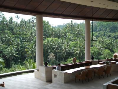 前年度お部屋を見せてもらいに訪問し、この景色に心を奪われて翌年泊まりました。本館スイートに宿泊。スイートはフラットタイプとメゾネットタイプの2種類あり、今回はフラットタイプを利用しました。ドアから左右に寝室とリビングが分かれて少し使いづらいですが、2F建てよりは使いやすいかと。バルコニーは2ヶ所あるし、寝転ぶ場所は沢山。プライベートプールがなくてもよければ経済的なスイートタイプで十分です。ファシリティーが優れていて、特にジムはお勧めです。この密林を見ながら(またはNHKを見ながら)走れるし、ジムに行くとさっとタオルと水を持ってきてくれます(ジンジャージュースもあり)。サウナもスチームと2種あるし、密林の戸外でのジャグジーも3種類の温度がありシャワーも清潔。ネットも無料で食事も高レベルです。館内は広くて散歩も出来ます。日本人利用が6割と多く日本人好みのサービスです。ただウブドゥ市内へのシャトルバスが夕方で終わりなのはちょっと不便。外のレストランを利用したのですが足はタクシーとなります。近所のGaya Restaurantは近いので無料で送ってもらえました。