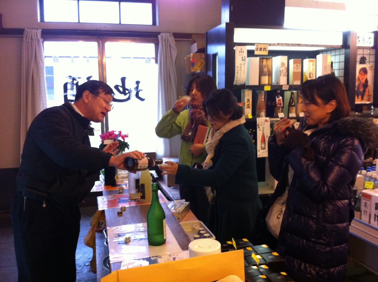 喜多方は蔵の暮らしの街といわれているのが特徴で、蔵を見学しなければと事前に「若喜商店」に連絡を入れ、蔵の見学希望を申し出たところ、ご主人自らが案内してくれました。「座敷蔵」という蔵を利用して大事なお客様をおもてなしする座敷を見学しました。蔵は味噌や醤油、酒などの醸造にも適しているため、出汁醤油の飲み比べ、日本酒の利き酒など、ご主人のユーモアたっぷりなトークとともに楽しませてもらいました。ここで夜に向けて日本酒を仕入れました。