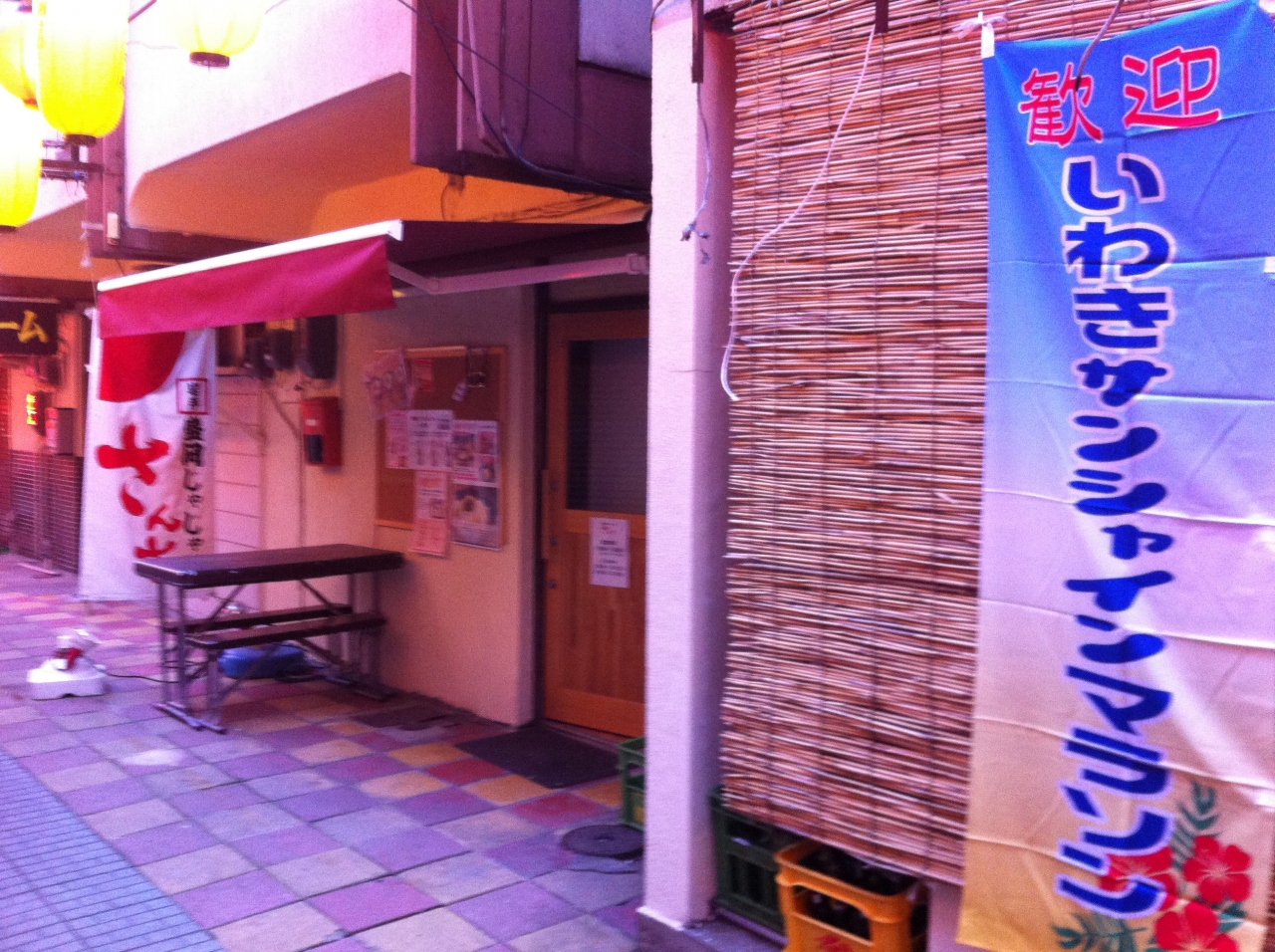 復興夜明け市場という駅前の飲食店街、駅からみてロータリーを超えて左手の、アーケード入り口すぐのお店です。1階はスタンド、2階が10人くらい入れる座敷です。