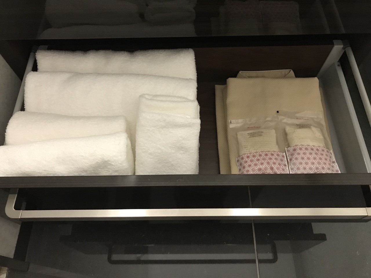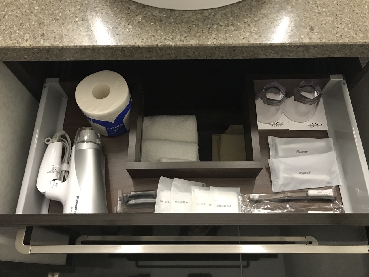 部屋は小さめですが至れり尽くせりの設備で、アメニティーの歯ブラシも良いものを使われていると感じました。シャンプー類はPOLAのESTHE ROYERでした。もちろんミネラルウォーターは毎日補充してもらえます。