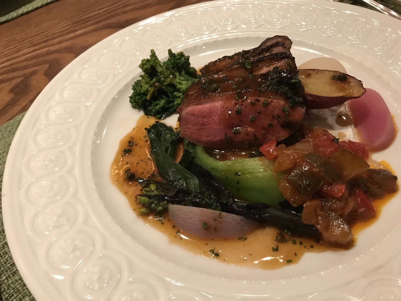鯛の切り身が入った柚子雑炊はとっても美味しかったです。旬物の筍は素朴な味で季節を感じることができ、朱塗の器に盛られたおばんざいも品のあるお味でした。鴨のローストだけ少し匂いが気になりました。