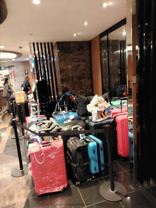 エレベーターに向かう通路以外はスーツケースで埋め尽くされています。