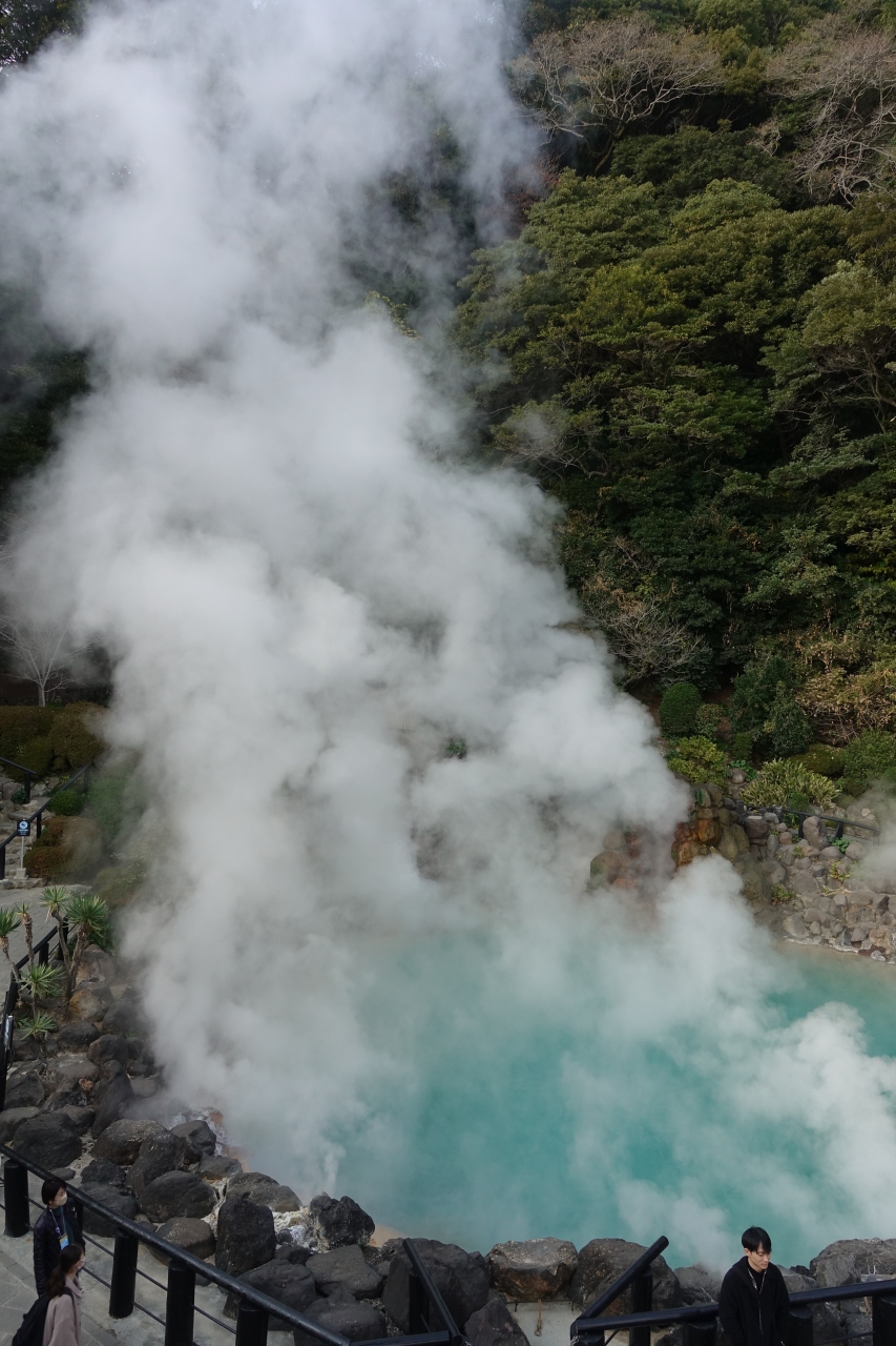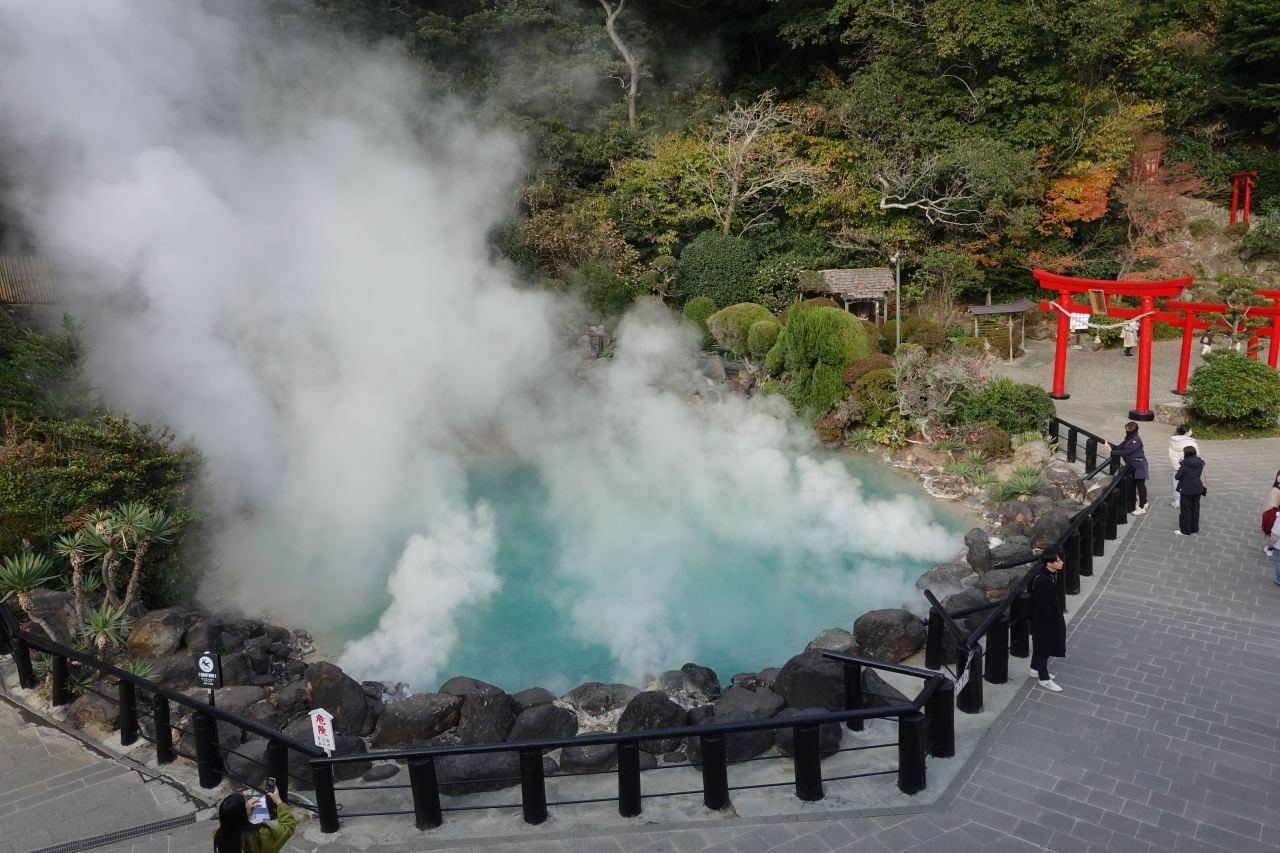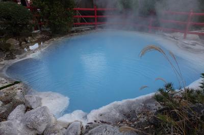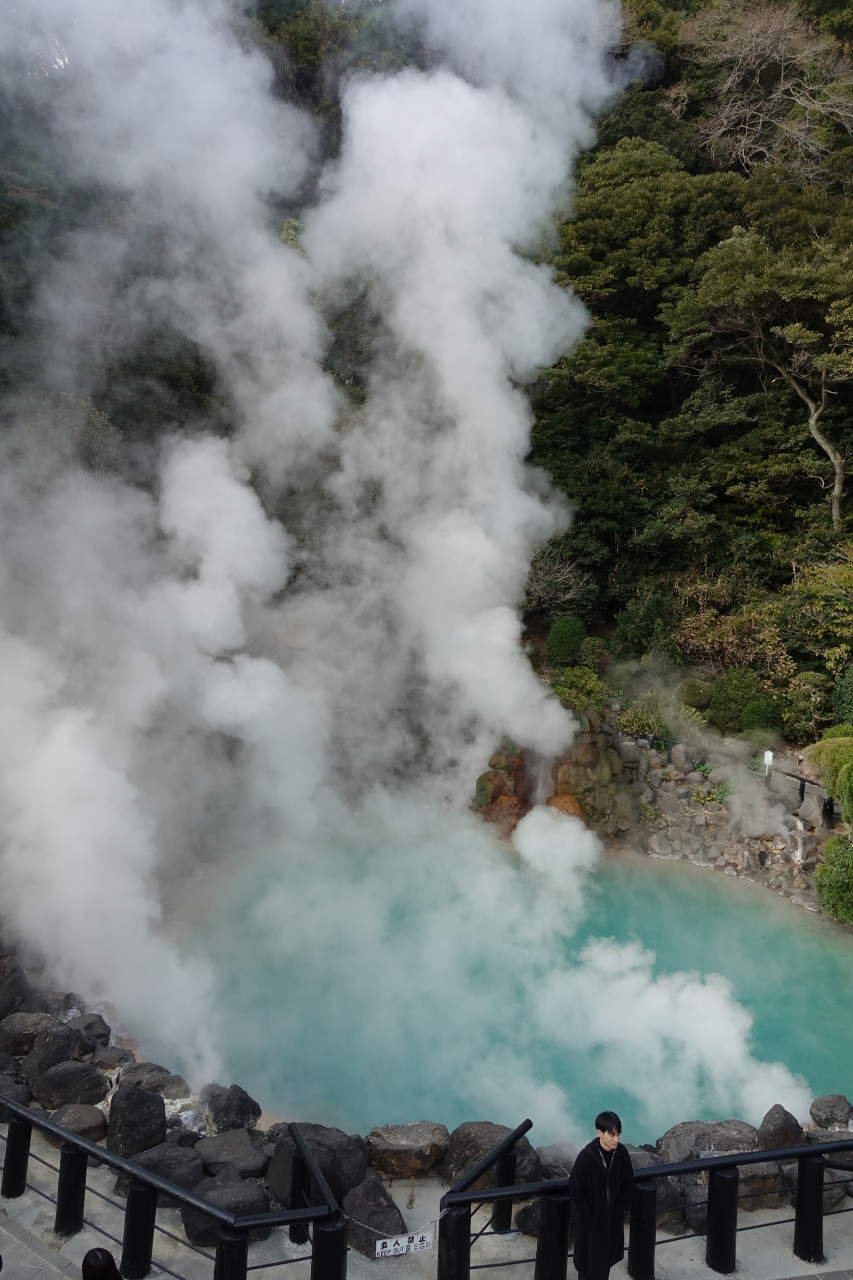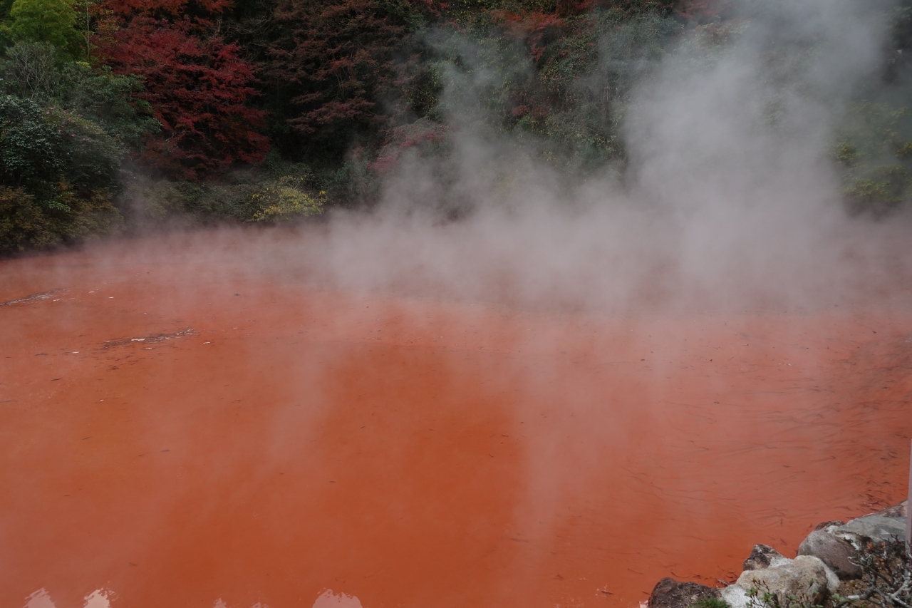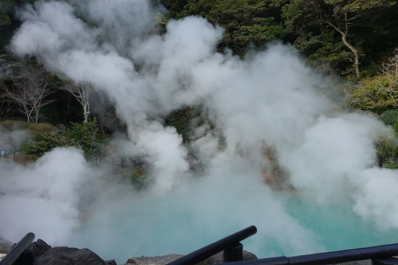 大きな売店を抜けるとモウモウと湯気と立てている青い池の海地獄がありました。
